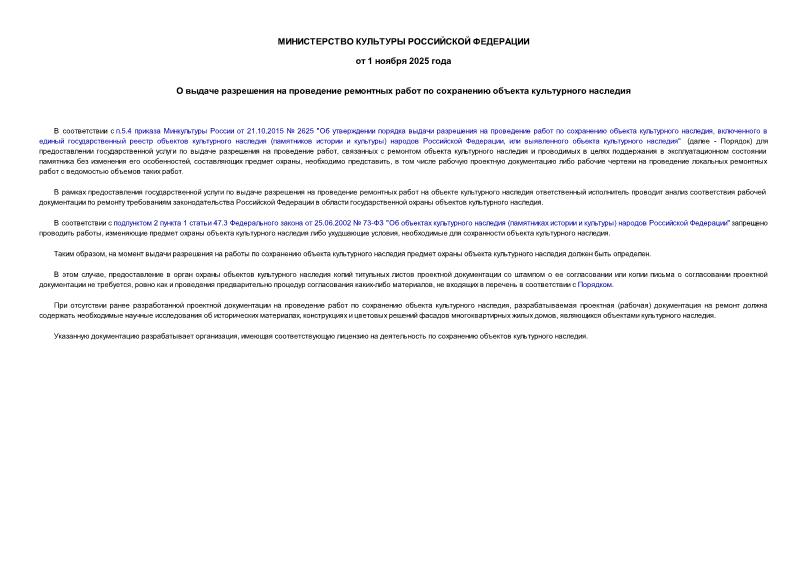 Наименование: О выдаче разрешения на проведение ремонтных работ по сохранению объекта культурного наследия