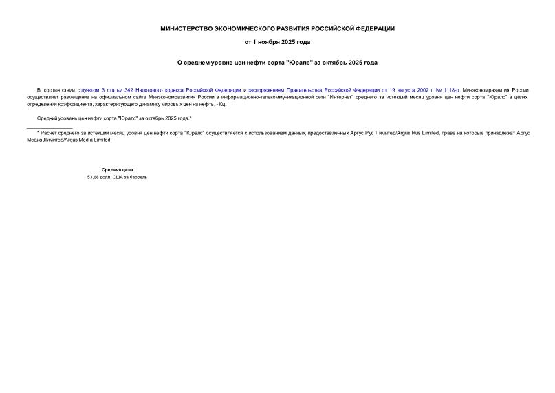 Информация О среднем уровне цен нефти сорта "Юралс" за октябрь 2025 года